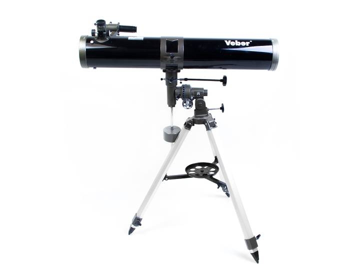Модель для серьезных, но начинающих любителей астрономии. Зеркало диаметром 114мм достаточно велико, чтобы собирать много света (в этот телескоп вы сможете увидеть объекты солнечной системы во всех подробностях - таких как щель Кассини в кольце Сатурна, лунные кратеры размером ок.5 км, слабые звезды до 13 m зв. величины). Габариты прибора довольно внушительные, длина трубы 86 см. Телескопы, построенные по схеме Ньютона, обычно дают перевернутое изображение, но Veber 900*114 оснащен 1,5х выпрямляющем окуляром для получения прямого изображения. С окуляром K25 вы получите увеличение 36х, с которым удобно вести наземные наблюдения. При этом ближняя точка фокусировки составит 22 м. Очень стильное исполнение телескопа: черная глянцевая металлическая труба в обрамлении выглядящих брутально крышек, колец и деталей монтировки, покрашенных фактурной порошковой эмалью, как это принято делать у профессиональных оптических приборов. Удобный искатель (увеличение 6х) расположен рядом с окуляром. Прибор оснащен серьезной монтировкой немецкого типа EQ3 с возможностью подключения электропривода (для постоянного наблюдения за выбранным объектом). Многие другие фирмы, в целях удешевления, устанавливают такие телескопы на монтировку EQ1, которая является для них откровенно слабой. Вся конструкция: телескоп-монтировка-штатив должна быть достаточно жесткой и гасить дрожания и колебания которые мешают наблюдениям. В данном телескопе алюминиевый штатив имеет еще и дополнительные распорки, на которые устанавливается столик для аксессуаров.
